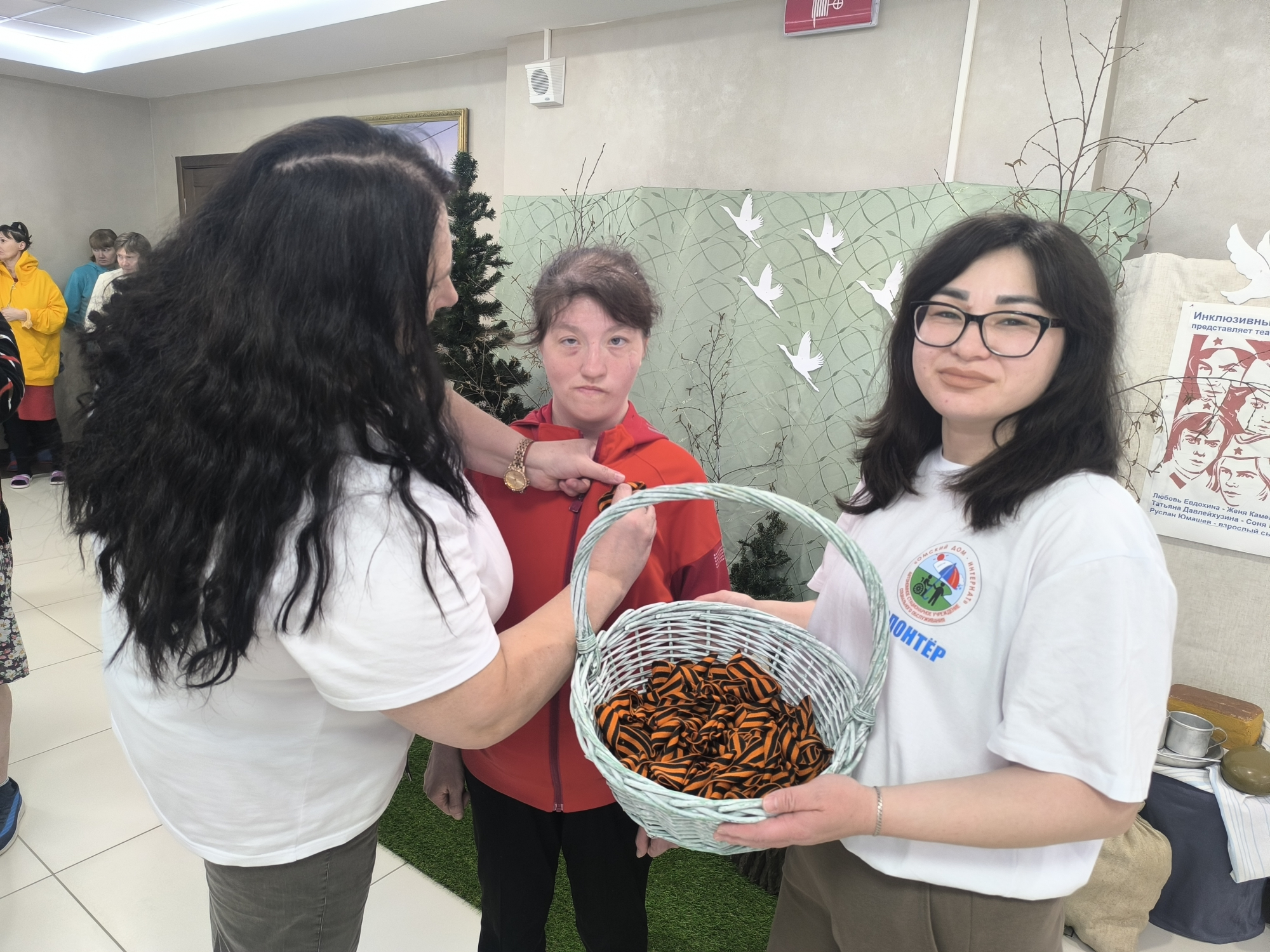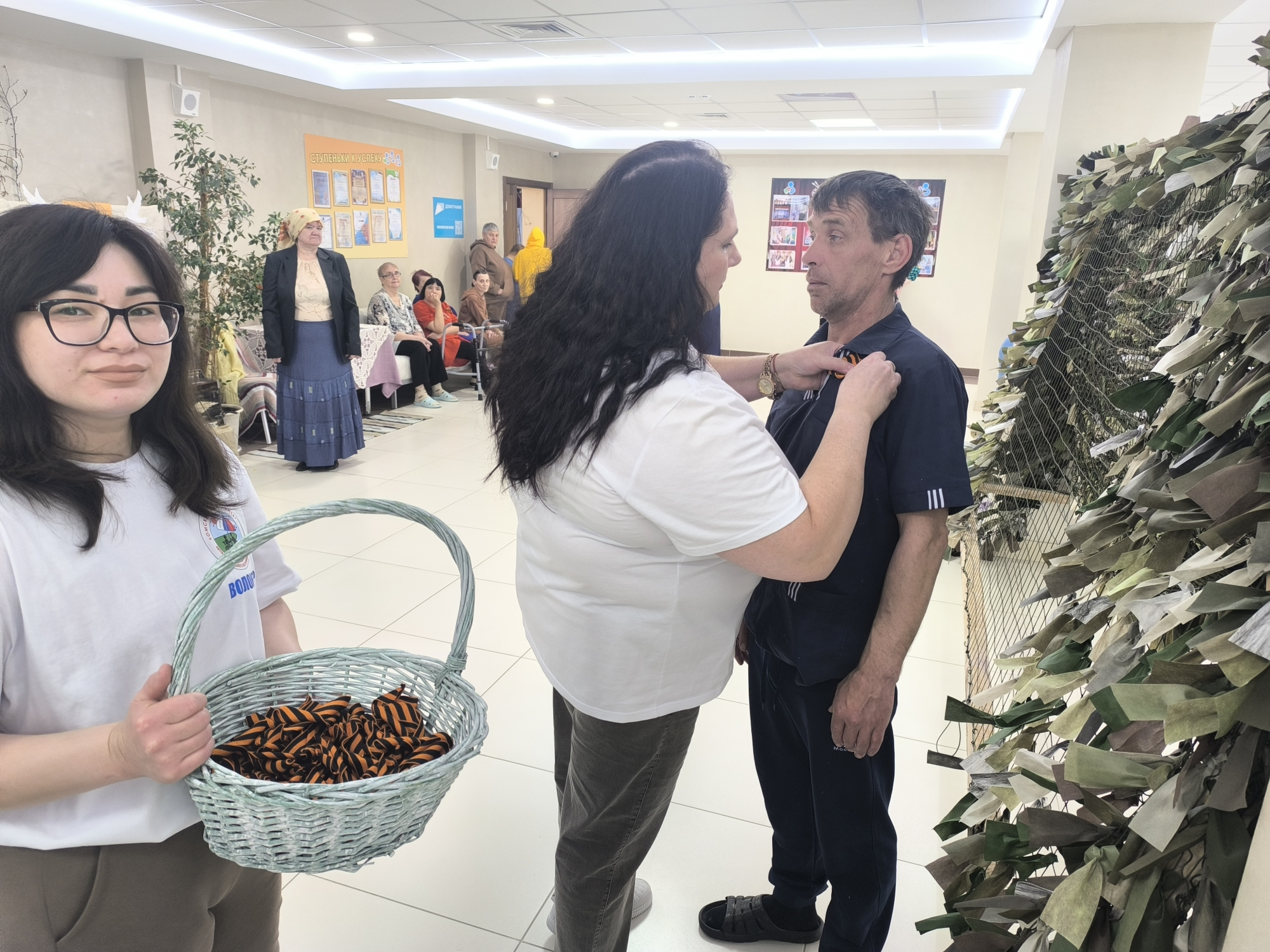 В этот день стены интерната наполнились атмосферой уважения и благодарности. Наши волонтеры с особым трепетом прикрепляли к одежде черно-оранжевые ленточки – символ воинской доблести и славы.