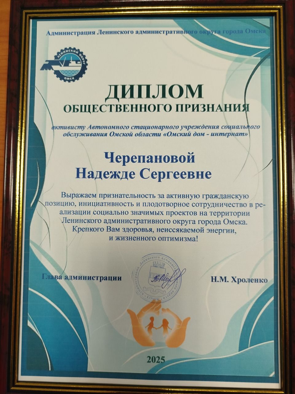 28.11.25г. на мероприятии, посвященном Дню инвалида от администрации Ленинского округа из Омского дома – интерната была награждена получатель социальных услуг Черепанова Надежда Сергеевна. Она активная участница спортивной, хореографической, творческой и волонтерской деятельности. Надежда была отмечена дипломом общественного признания